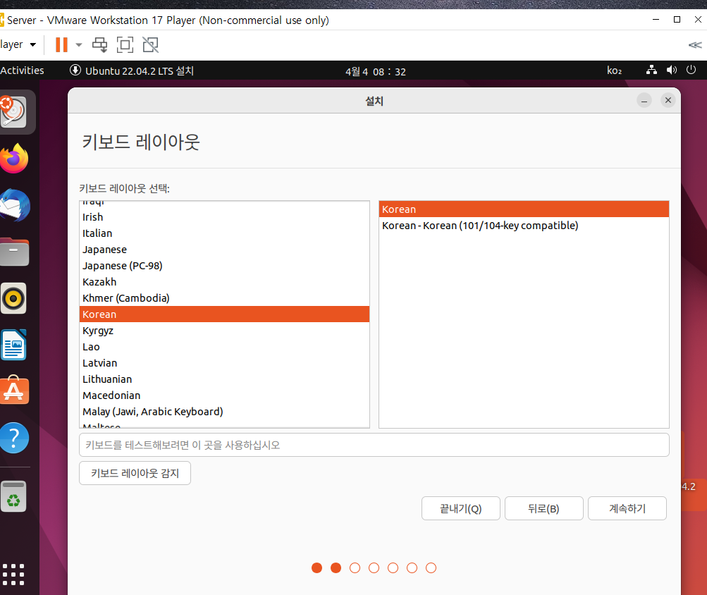 4. 키보드 레이아웃 설정 후 계속 진행한다.