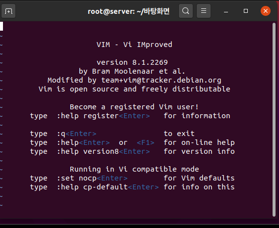 vi에디터를 실행하면 처음화면에 도움말이 뜨는데 작성을 하려면 i 또는 a를 입력해 주어야 한다.