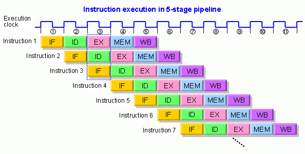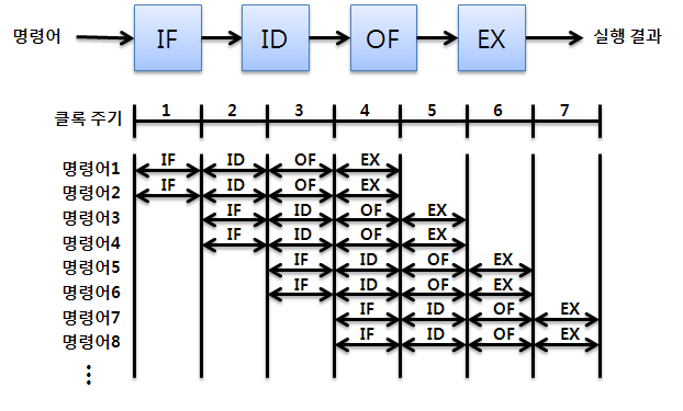 명령어 파이프라인(instruction pipeline)은 명령어를 읽어 순차적으로 실행하는 프로세서에 적용되는 기술로, 한 번에 하나의 명령어만 실행하는 것이 아니라 하나의 명령어가 실행되는 도중에 다른 명령어 실행을 시작하는 식으로 동시에 여러 개의 명령어를 실행하는 기법이다. (출처 : 위키백과)