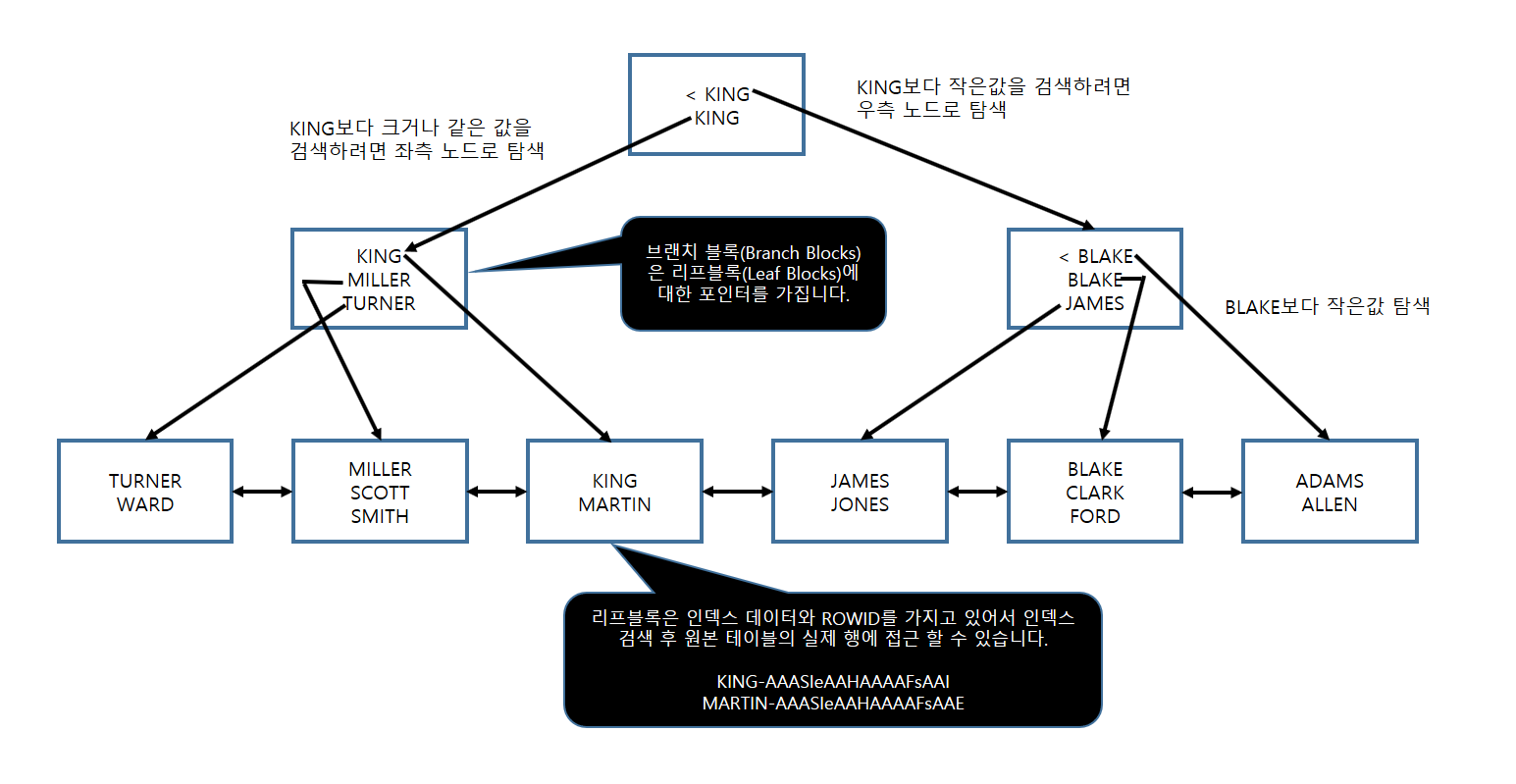 인덱스를 생성하게 되면 대부분의 경우 위 그림처럼 B * tree가 생성되게 된다. 맨 위의 노드를 root라고 하고 가이드를 제공해 주는 노드를 branch라고 하며 인덱스로 지정한 컬럼의 값과 원본 테이블의 rowid를 가지고 있는 노드가 정렬된 채로 맨 마지막에 양방향연결리스트로 연결되어져 있다. 가장 밑단의 노드들을 리프노드라고 한다.